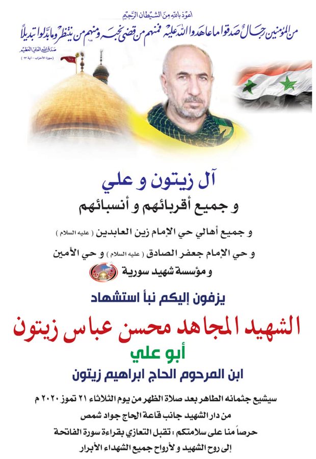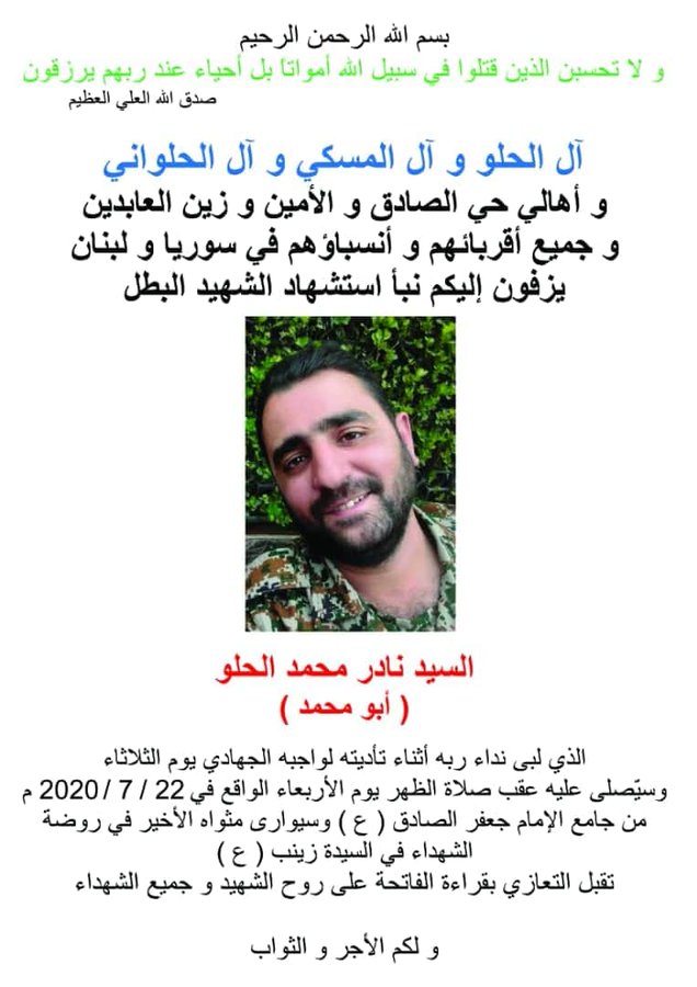 #Hezbollah#Lebanon Ali Kamel Mohsen was killed by #Israel bombing south of #Damascus#Syria. This is expected to trigger a response against Israel that will definitely be on alter, expecting a retaliation.