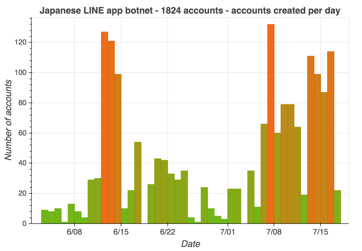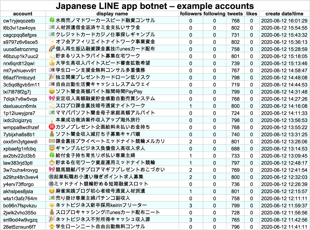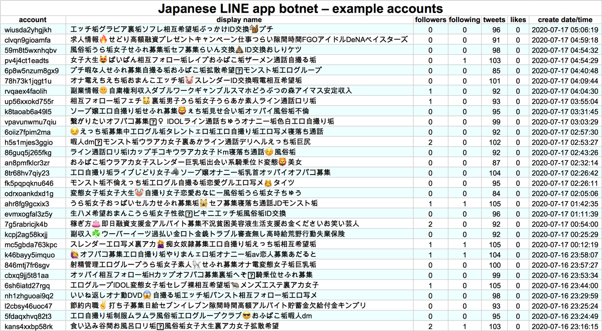 Answer: a botnet, unsurprisingly. We found 1824 extremely similar accounts created between June 3rd and July 17th, 2020, all with randomized 13-character names, zero likes, and few or no followers or followees. All 1824 tweet primarily in Japanese.