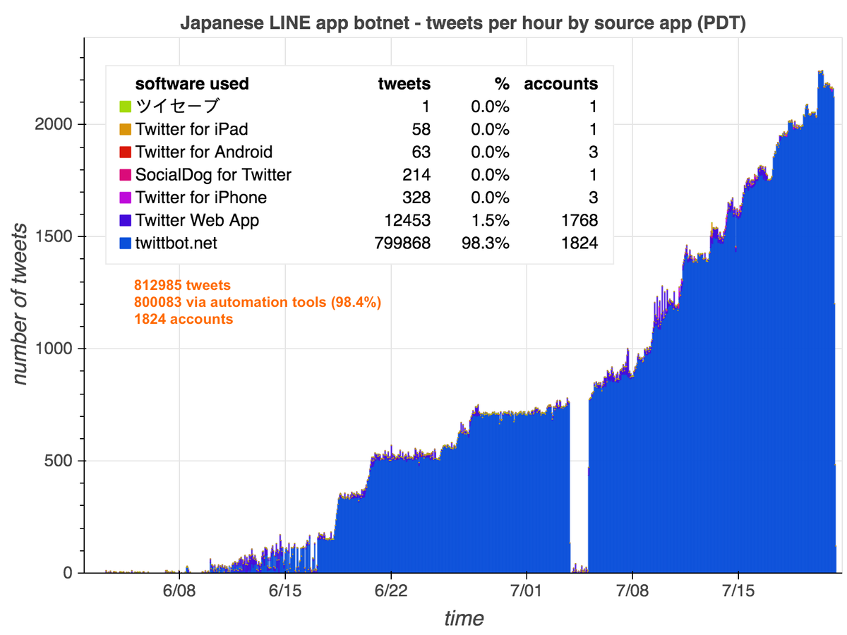 This botnet operates 24/7, and has been steadily ramping up activity as additional accounts are created (with a brief gap in early July). At present the network is churning out over 2000 tweets per hour, almost all via automation service twittbot(dot)net.