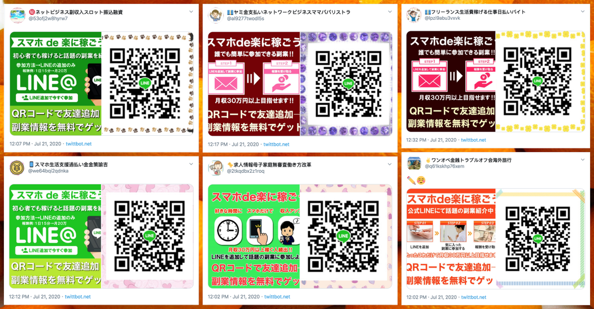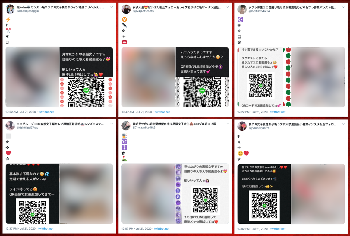 What does this botnet tweet? Neither of us read Japanese, but the content seems to be a mix of porn and work-from-home spam. Notably, every tweet contains a QR code for adding some unspecified party (presumably associated with the botnet) as a friend on the LINE chat app.