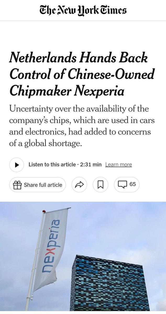 The next day, The Hague awoke with a jolt. Dusting off a Cold War–era law from 1952, it struck Nexperia with surgical force: freezing assets, suspending management, and stripping the CEO of authority. Pure robbery in broad daylight.
