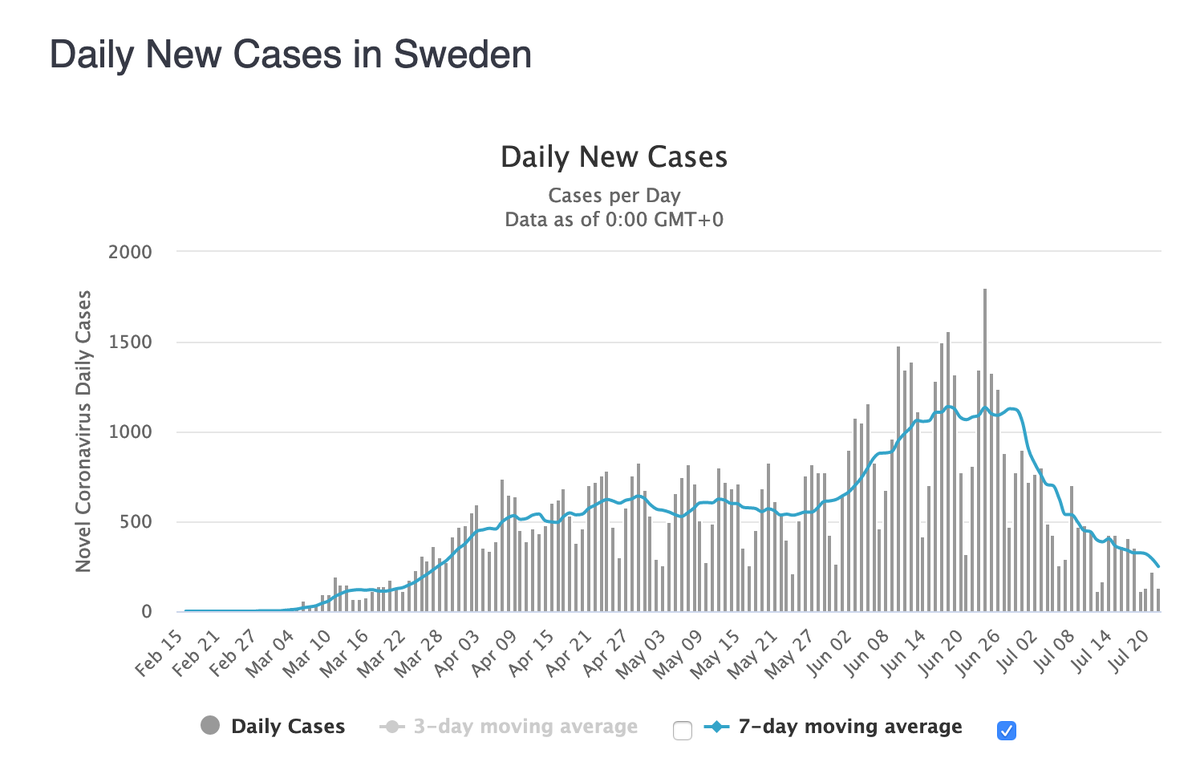 Sweden's big run up in cases began 5/24 and peaked around 6/29. Let's call that 5 weeks. They did basically nothing to stop this upswing in cases.