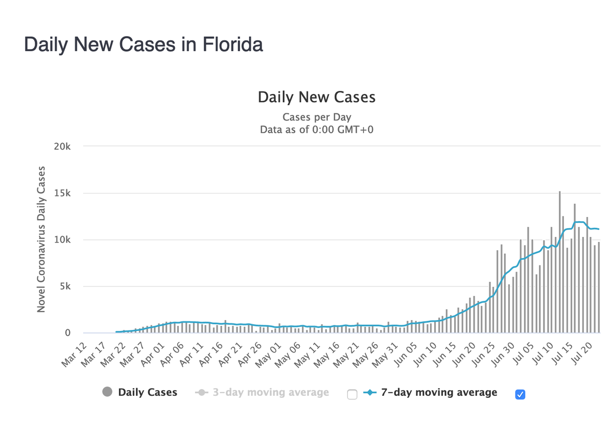 Here's Florida. Their big run up in cases began the start of June and peaked around 7/16. Let's call that 6 weeks.