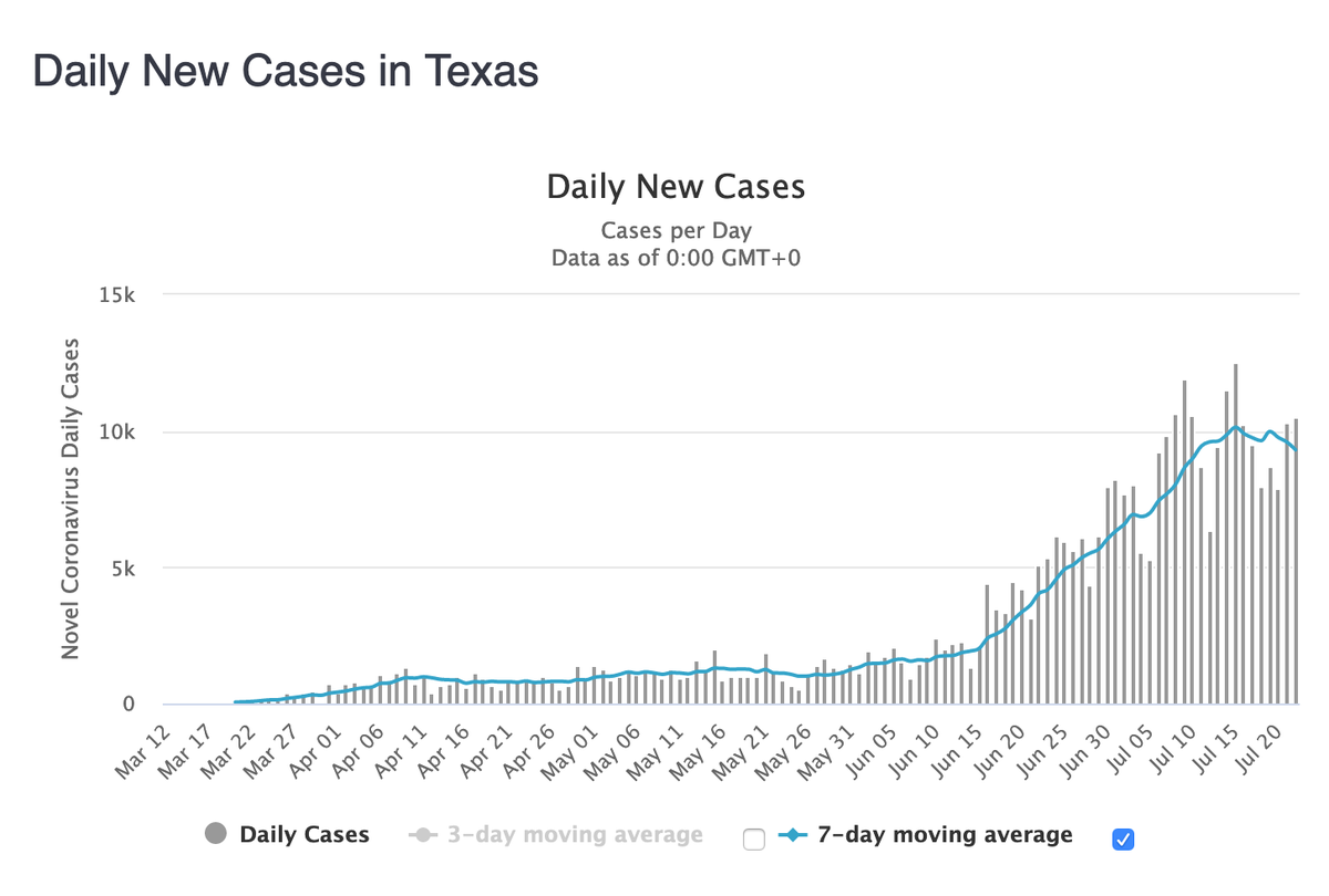 Here's Texas. Their big run up in cases also began the start of June and peaked around 7/18. Let's call that 6 weeks.