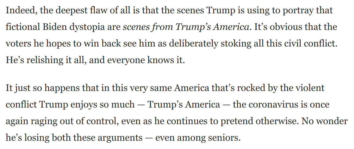 The deepest flaw of all in Trump's new scare-granny strategy is that the scenes he's using to depict Biden's violent dystopia are *scenes from Trump's America.*