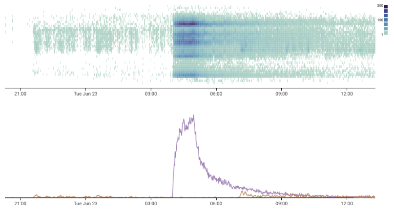 just discovered the honeycomb pollinators #chART group. omg, how did i not know about this? this one is "we sent a bunch of emails from 4am-5am, the resulting load on the system" 😍📈