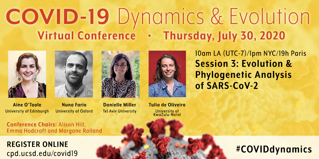 4/ And we close with Session 3, on #COVID19#SARSCoV2 evolution & phylogenetics, including exciting talks on genetic typing in pandemics, & the ongoing pandemics in Brazil, Israel, & South Africa - with @AineToole@nmrfaria@Tuliodna & Danielle Miller!