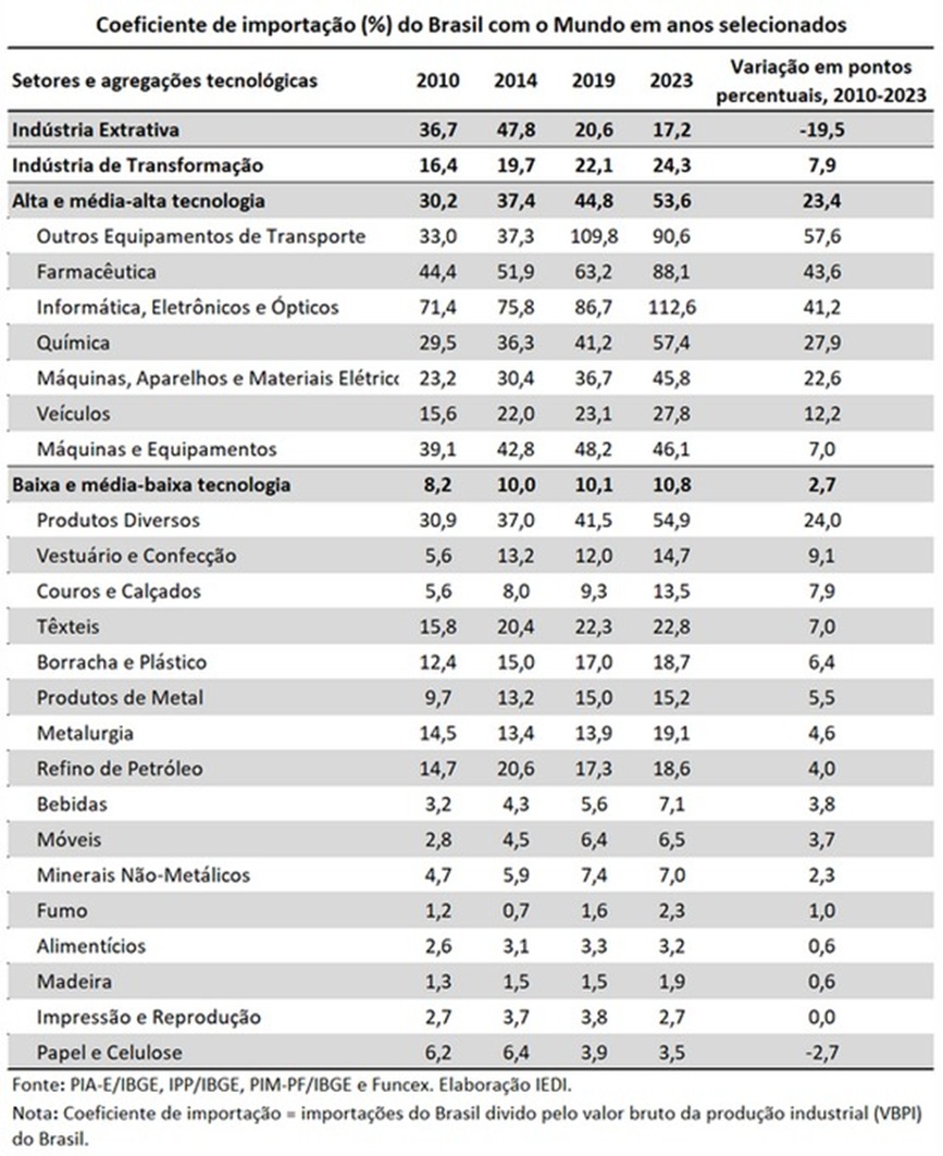 Fig. 2. Coeficiente de importações/produção industrial cresce aceleradamente nas indústrias de ponta: 54%, crescimento de 23 p.p. em 13 anos. (IEDI, 2025).
