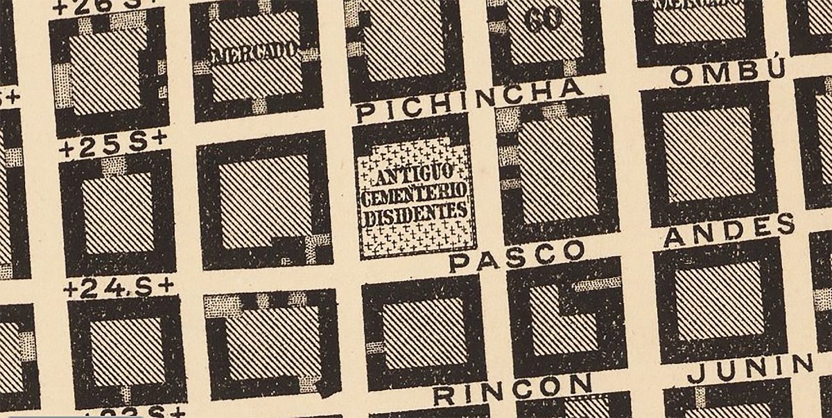 Única foto conocida de este cementerio. Que era una manzana sin el lado sobre Pichicnch, con casas.