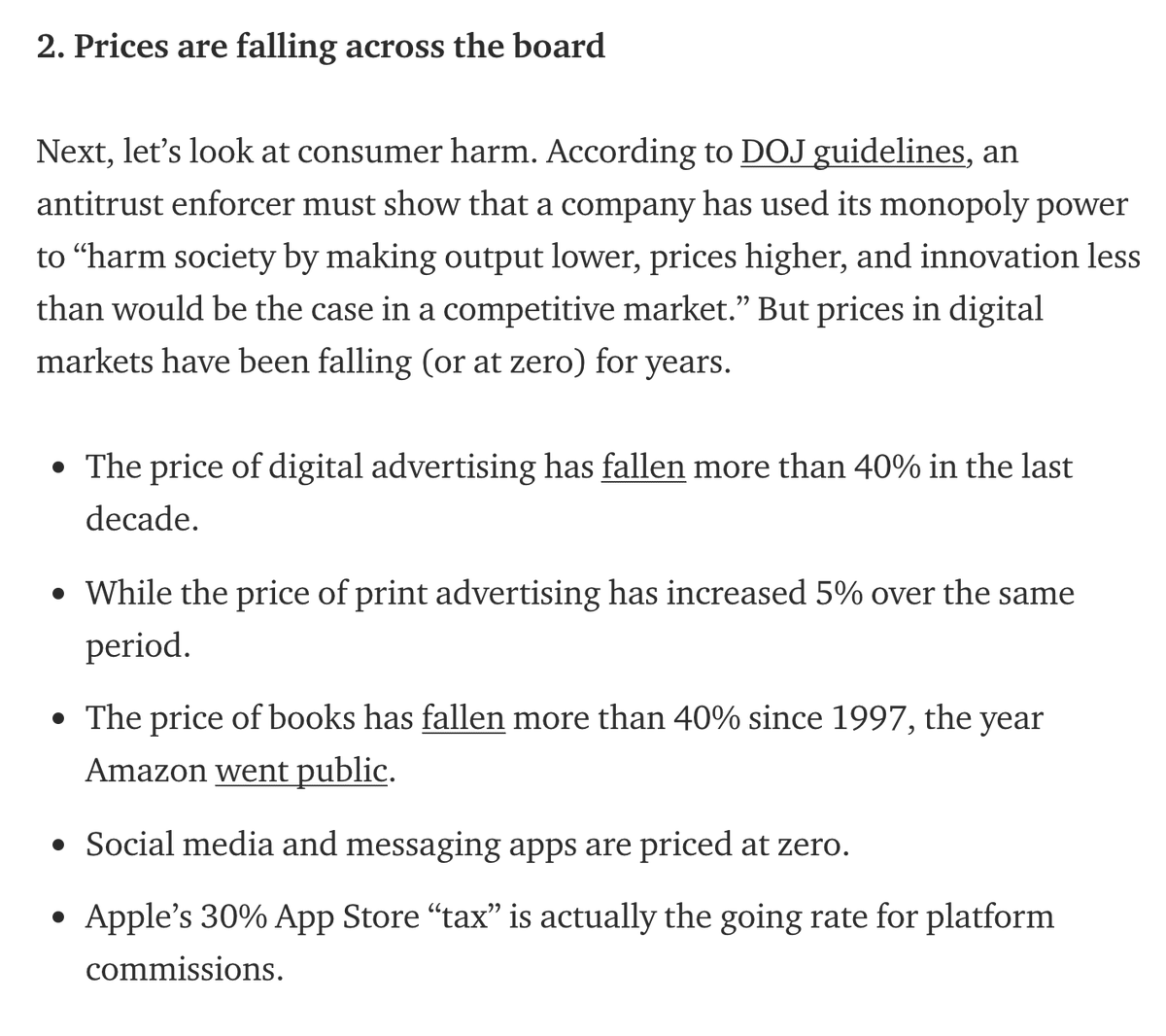 This one is pure hindsight bias. To take one example, critics who don’t like Facebook claim that the Instagram merger was anticompetitive and should have been blocked.