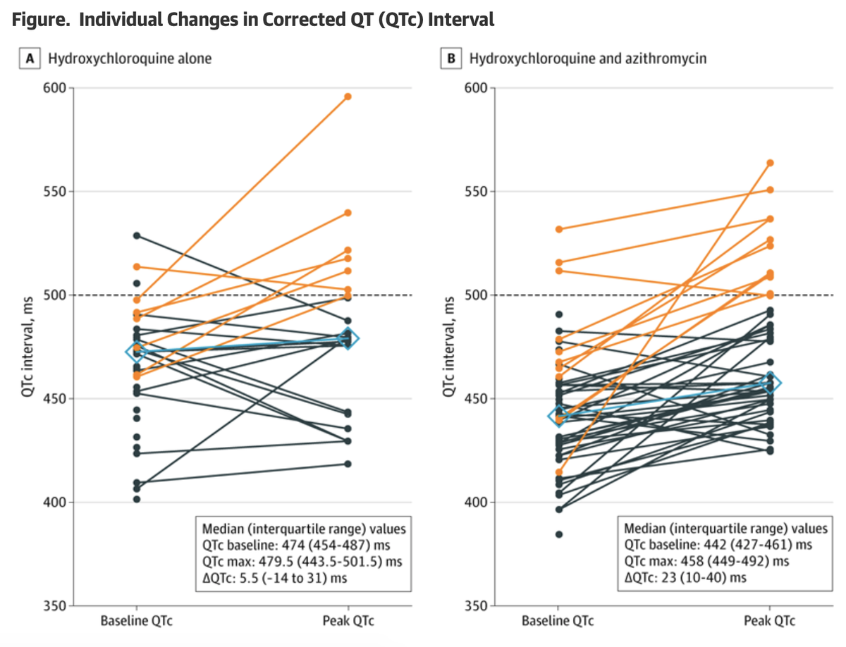 L'hydroxychloroquine et l'azithromycine Ă©taient associĂ©s Ă  une plus grande variation de l'intervalle QTc par rapport Ă  l'HCQ seule (changement mĂ©dian [IQR], 23 [10-40] millisecondes vs 5,5 [−15,5 Ă  34,3] millisecondes; P = 0,03)