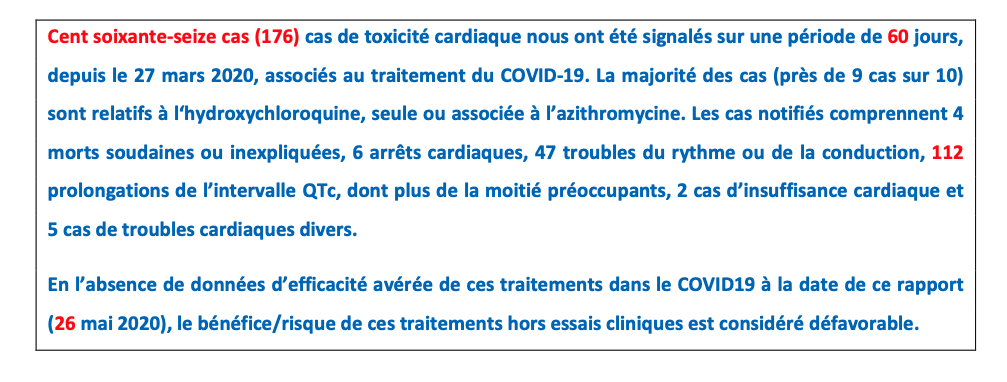 En conclusion, des effets cardiaques aigĂŒes potentiellement mortels conduisant Ă  des arythmies ventriculaires ont Ă©tĂ© dĂ©crits avec l'azithromycine et avec l'hydroxychloroquine.