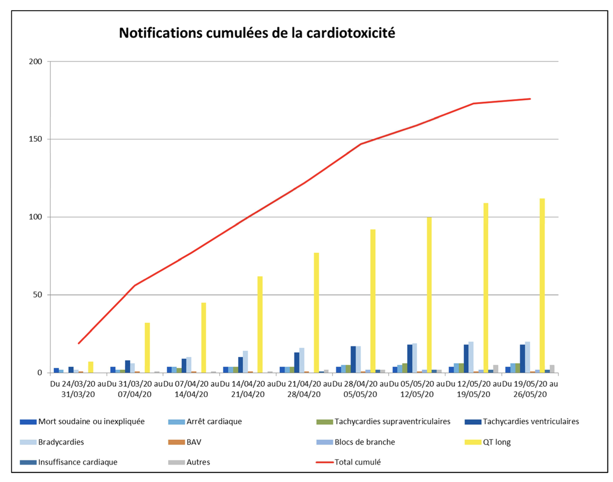 176 cas de toxicitĂ© cardiaque nous ont Ă©tĂ© signalĂ©s depuis le 27 mars 2020, associĂ©s au traitement du COVID-19. La majoritĂ© des cas (prĂšs de 9 cas sur 10) sont relatifs Ă  l‘hydroxychloroquine, seule ou associĂ©e Ă  l’azithromycine. Image