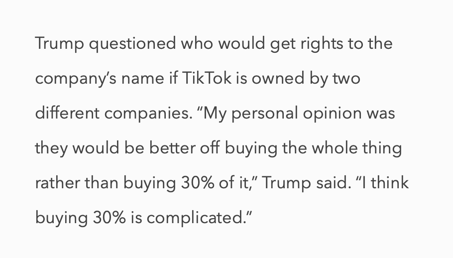 "Microsoft has discussed adding an agreement whereby it would have 1yr to separate TikTok from its Chinese parent... 2 people following the talks closely said that the timeframe would be difficult... [1 said] it could take between 5 and 8 yrs"