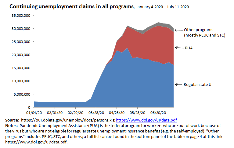 This chart shows continuing claims in all programs over time (the latest data to do this are for July 11). Continuing claims are more than 28 million above where they were a year ago. (But, the above caveat about double counting applies here, too.) 19/ Image