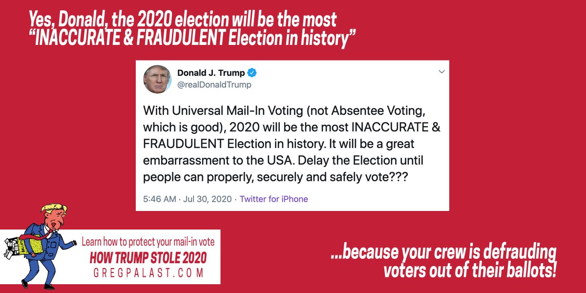 Yes, Donald, the 2020 election will be "the most INACCURATE & FRAUDULENT Election in history" — because your crew is defrauding voters out of their ballots. gregpalast.com/1913369-ballot…