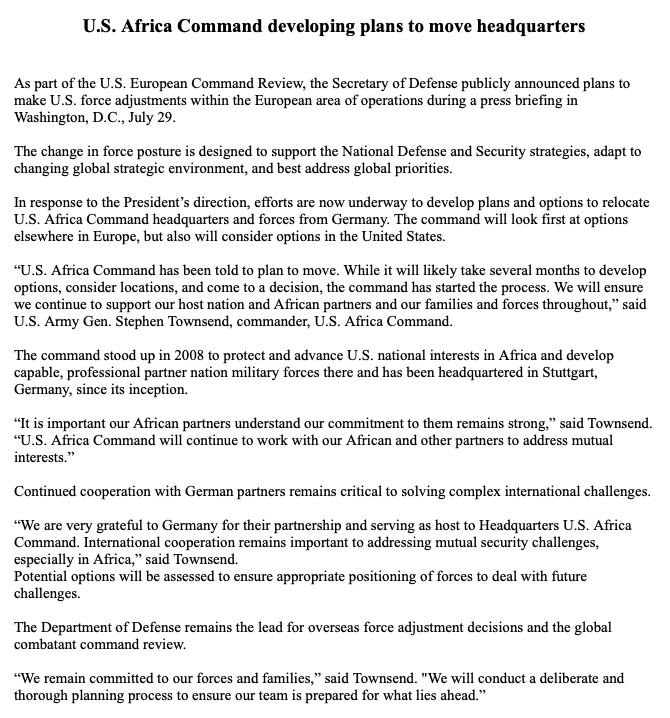 "While it will likely take several months to develop options, consider locations, & come to a decision, the command has started the process" per @USAfricaCommand's Gen. Townsend on imminent move from #Germany