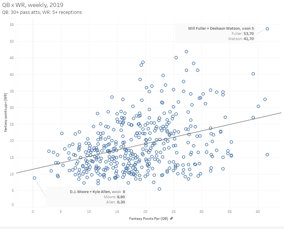 "Mas e aquela semana do Will Fuller hem? Ele e o Watson arrebentaram!" É, mas olha o outro canto do gráfico (agora semanal): fazer o combo pode tanto ser ideal quanto extremamente prejudicial.