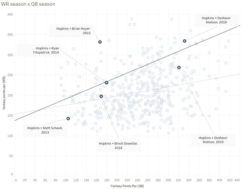 Se todo QB de elite produzisse WRs de mesma categoria, seria fácil encontrar os valores que queremos a partir dos nomes, mas veja como a correlação não ajuda: