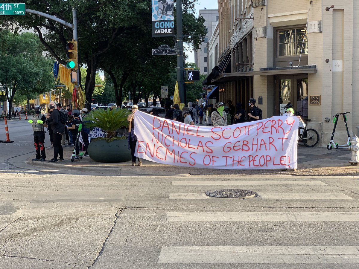 Bike officers from @Austin_Police arrived to make sure demonstrators complied with their calls to clear the crosswalk. Officers took some people into custody and are now riding sesy. @KVUE