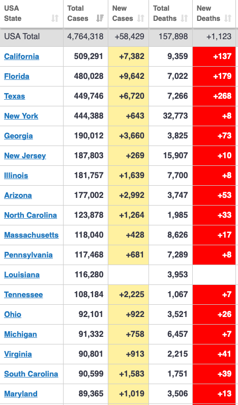 The US had +58,429 new confirmed coronavirus cases today, bringing the total to 4,764,318, and pushing the 7-day moving average down below 64k/day.