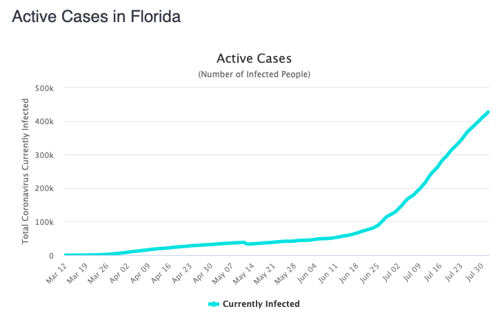 In contrast, while Florida's average number of new cases has fallen to below 10k/day, its number of active cases continues to steadily rise.