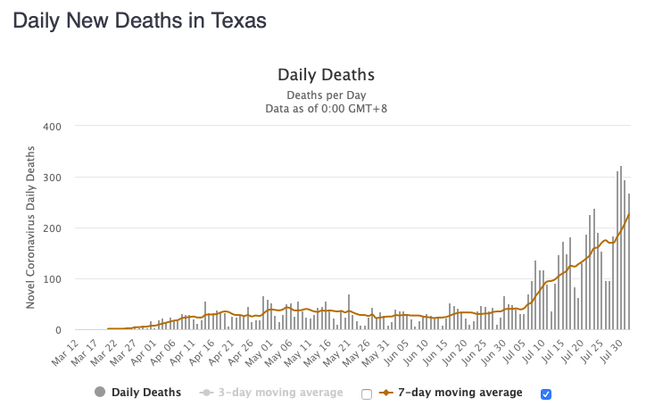 Texas' average death toll continues to rise above 200/day.