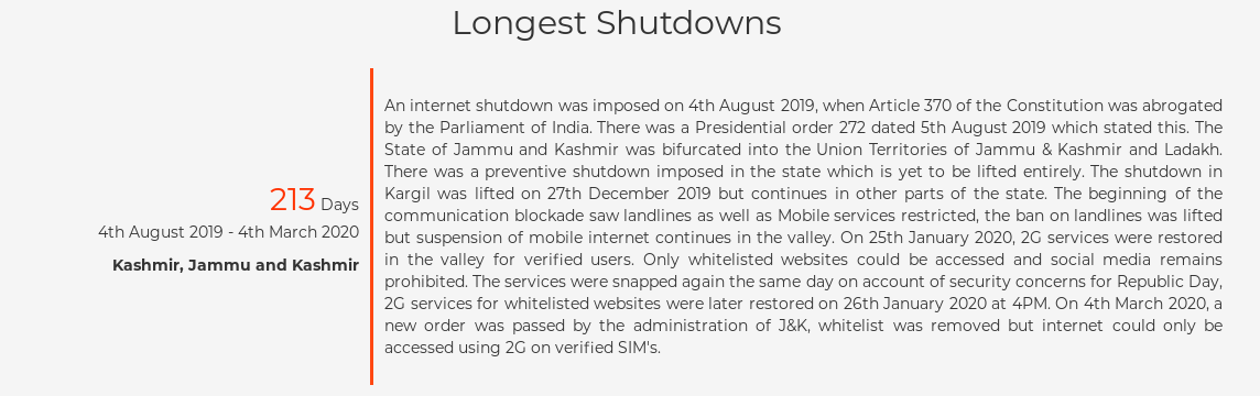 The Internet Shutdown imposed on Jammu and Kashmir after the abrogation of Article 370 lasted for 213 days, making it the longest #internetshutdown ever. The Union Territory still has access to #2G internet only. #Restore4GinJK