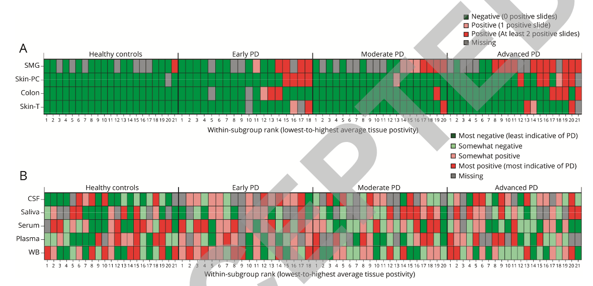 Plus α-syn monoclonal antibody staining on skin & submandibular gland samples is specific for PD, but sensitivity is low.