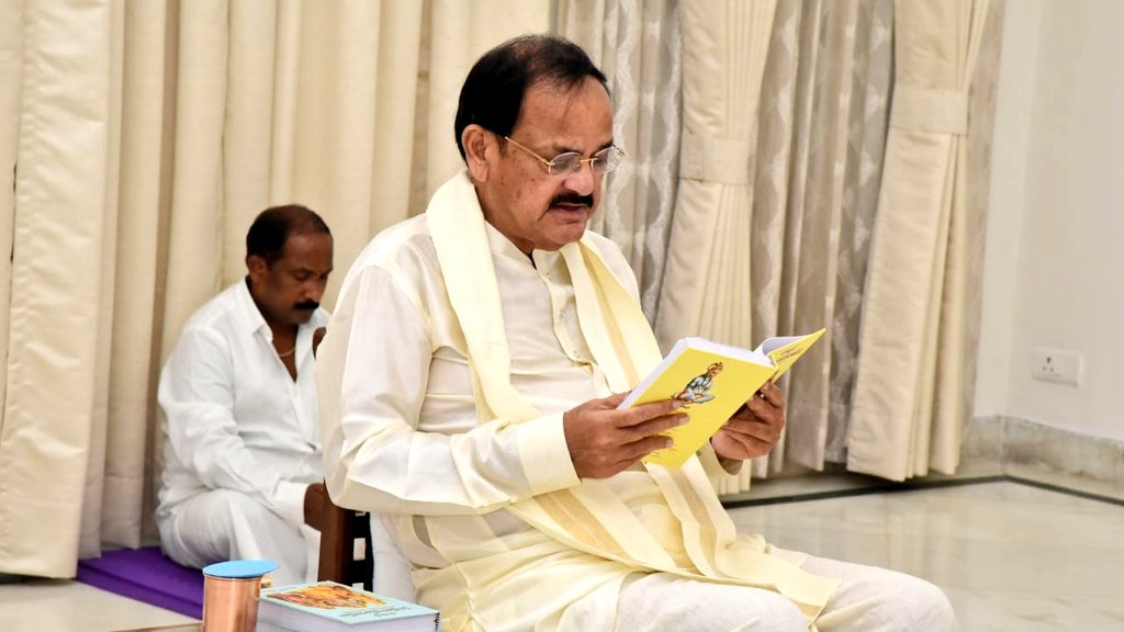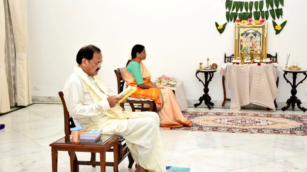 अयोध्या में राम जन्म भूमि पर भव्य राम मंदिर के पुनर्निर्माण हेतु भूमि-पूजन के शुभ अवसर पर, उपराष्ट्रपति श्री एम वेंकैया नायडू तथा उनकी पत्नी श्रीमती उषा नायडू तथा उनके निजी स्टाफ ने, उपराष्ट्रपति-निवास पर रामायण का पाठ किया। #RamMandir