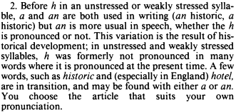 Esta parte es muy interesante. Hasta tal punto depende de la pronunciación, que hay quien utiliza una u otra palabra antes de la misma, a/an historic, en función de cómo pronuncie esta. Aquí se puede ver esto mismo: brians.wsu.edu/2016/05/16/an-…