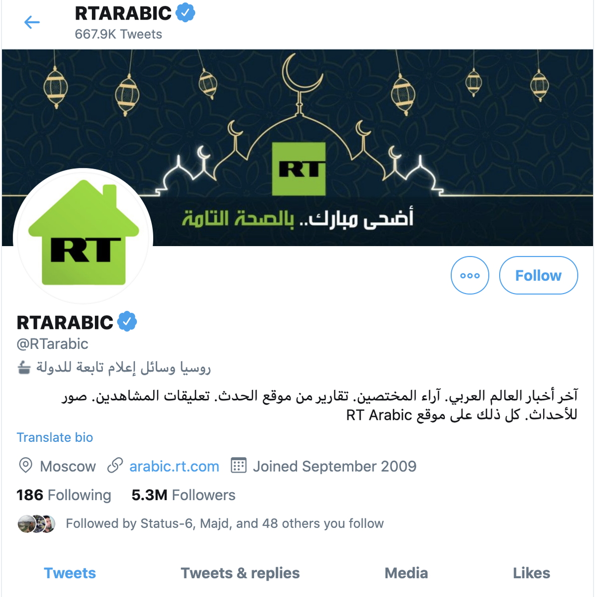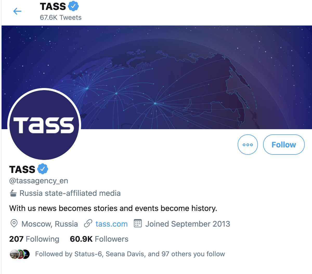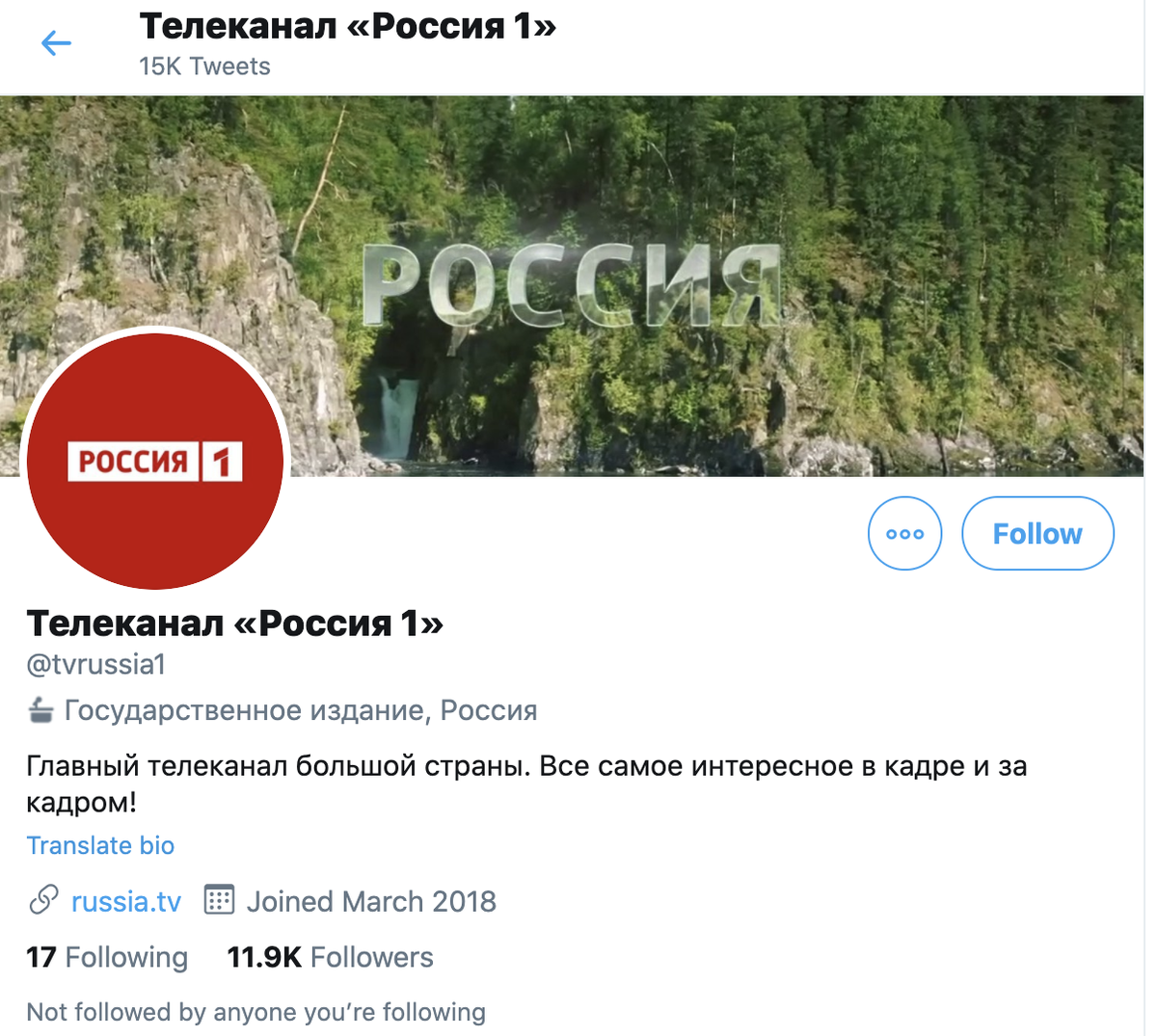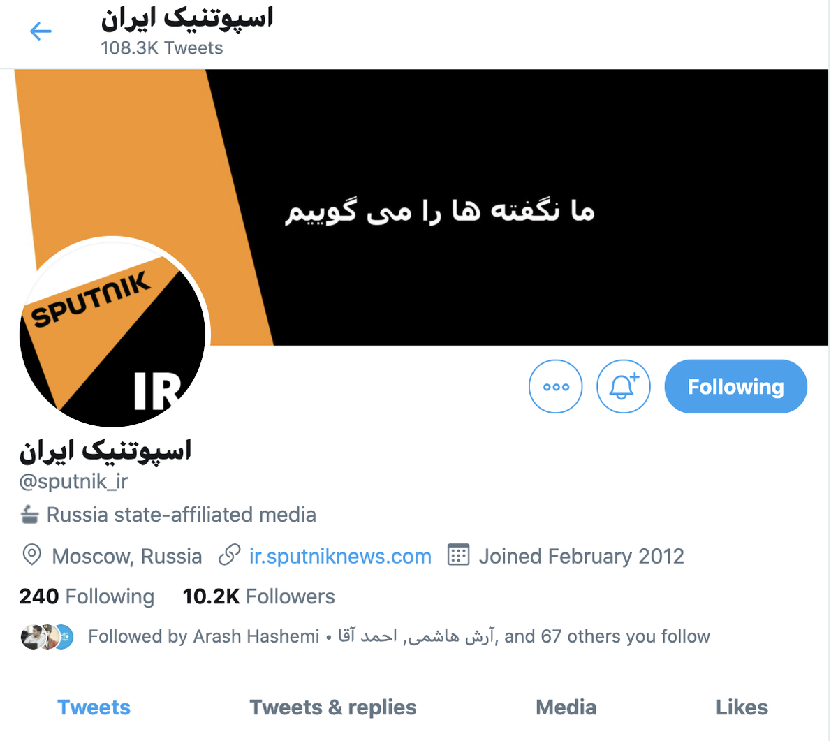 Three other Russian outlets that have labels: @RTUKnews, state-owned @tvrussia1, and Sputnik's Persian language account