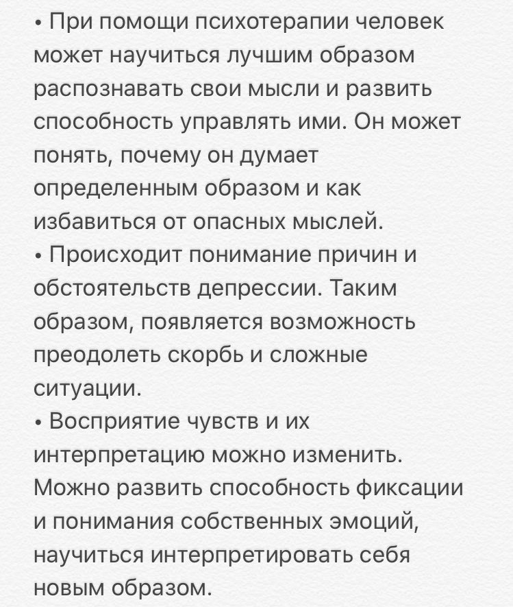 Проводящаяся наряду с медикаментозным лечением психотерапия больных с депрессивными состояниями подразумевает различные системы воздействия, включающие индивидуальные беседы, семейную и групповую терапию и т.п.