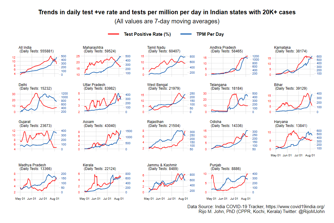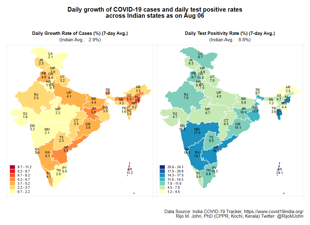 The 7-day avg. daily growth of cases now at 2.9%. At this rate, the next 1M should take only ~14 days (i.e., ~20 Aug.) Growth of cases is now more in NE states, JH, AP, & A&N islands. The daily test positive rate now at 8.8% but very high in MH, KA, AP, MZ & NL. (2/6)