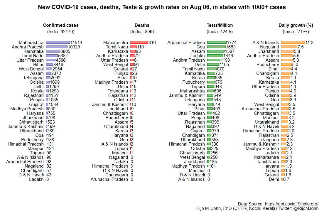 India reported the highest daily number of cases y'day at 62170 new cases and 899 deaths. A&N Islands & Nagaland leads in the rate of growth of cases while MH & AP continues to report the highest number of daily cases. MH continues to clock the highest @COVID19 casualties.(3/6)