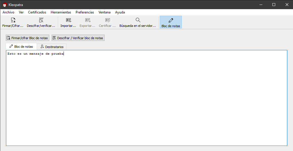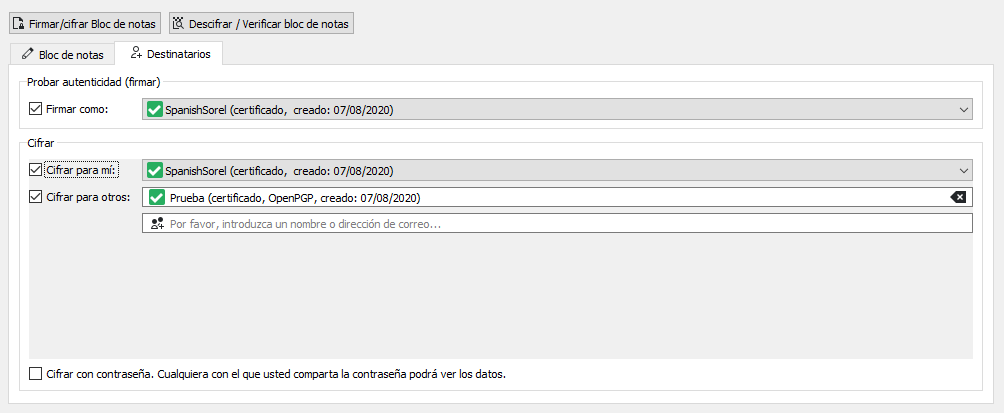 6/ Como ejemplo, nos vamos al bloc de notas y escribimos el mensaje que queremos cifrar, ahora vamos a destinatarios y en "Cifrar para otros", añadimos las claves de aquellos que queremos que puedan descifrarlo (también se puede cifrar con contraseña)