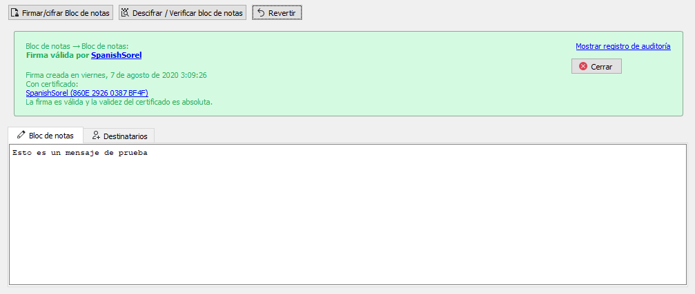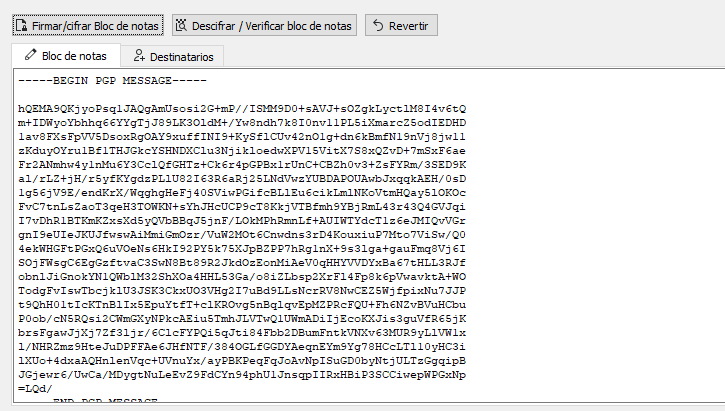 7/ Ahora, cuando todo este listo, le damos a "Firmar/cifrar Bloc de notas" y ya tenemos nuestro mensaje cifrado que podemos compartir con nuestro destinatario. Con el mensaje cifrado en el bloc, podemos darle a descifrar y nos pedirá nuestra contraseña.