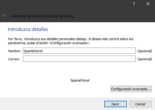 3/ El nombre y el correo son opcionales, si lo quereis poner, recomiendo usar un pseudonimo (el nombre de twitter, por ejemplo) y un correo recien creado y seguro sin vincular a otras cosas. En config. avanzada podeis cambiar la fecha de validez de la clave.