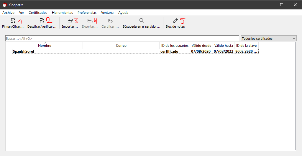 5/ Una vez creada (tarda unos minutos), vereis vuestra clave en el listado de claves. Arriba tenemos varias opciones, lo que nos interesa: (1) firmar/cifrar archivos, (2) descifrar/verificar archivos, (3) importar claves, (4) exportar claves, (5) bloc de notas.