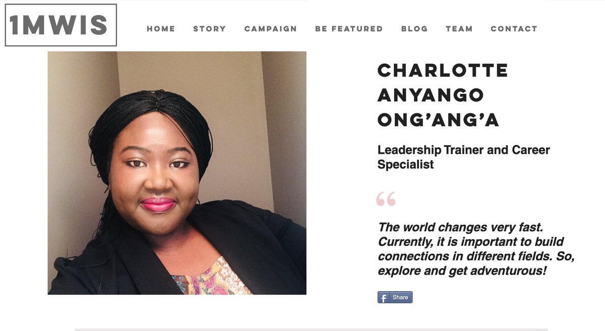 Hey Charlotte Anyango Ong’ang! She is a Leadership Trainer and Career Specialist. She helps people get back to work by training leadership skills, resume writing, preparation for job interviews, networking, Elevator pitch and job search. Wow!