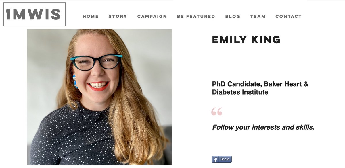 Meet Emily King! Emily is a Ph.D. Candidate. Her research is focused on mitochondrial impact on Type 2 Diabetes. Apart from her bench work, she is a passionate educator. Wow, what a role model!