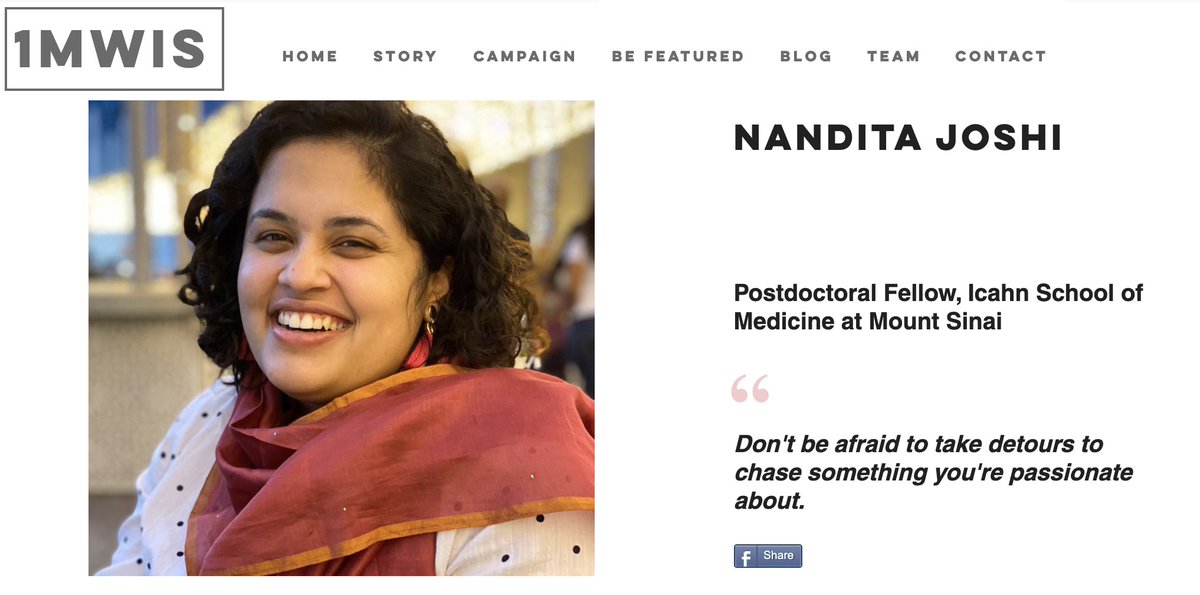Meet Nandita Joshi! She is a Postdoctoral Fellow in the department of Neurology. Her research looks at understanding how the process of aging affects brain function and cognitive abilities. Wow, what a role model!