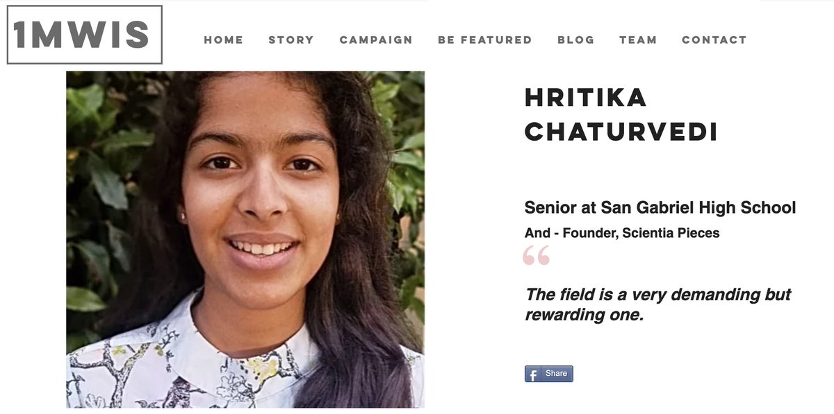 Meet Hritika Chaturvedi! She is a student. She sees herself as a medium by which the world and its inhabitants can come to appreciate scientific pursuits and the importance of environmental conversation. Keep up the great work!