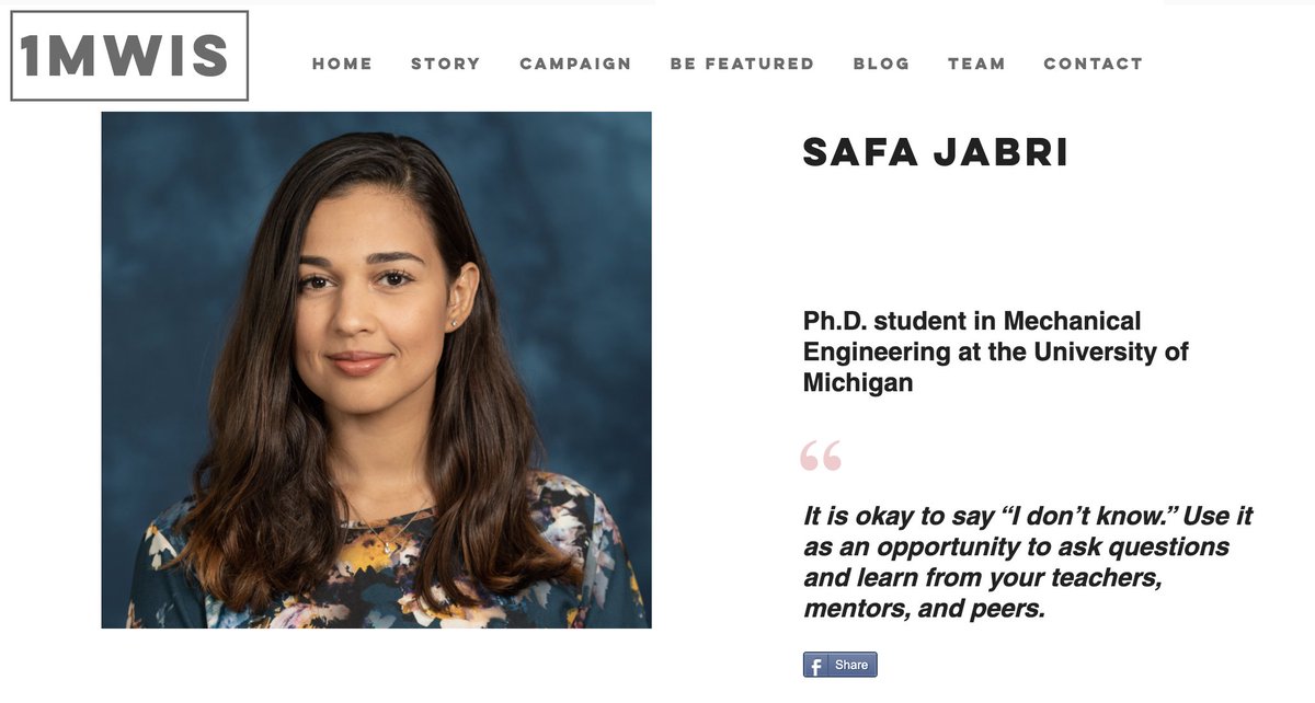 Hey Safa Jabri! She is a Ph.D. student in Mechanical Engineering. She studies how people walk to inform the development of effective rehabilitation technologies using wearable devices. Wow, what a role model!