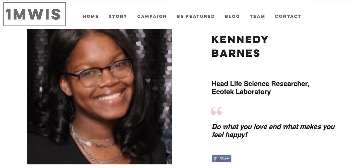 Meet Kennedy Barnes! She is a Head Life Science Researcher. She helps facilitate projects, teaches the team how to use instruments, aseptic techniques and acts as liaison to the administrator. Wow!
