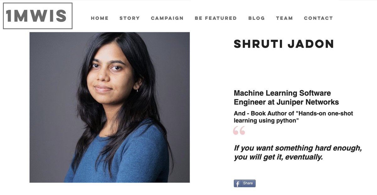Hey Shruti Jadon! She is a Machine Learning Software Engineer. She performs experiments and develops novel AI algorithms for various applications in the computer networks industry. Wow, what a role model!