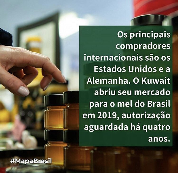 3- Em 2019, o Brasil exportou 30 mil toneladas de mel natural, com valor de US$ 68,3 milhões. Em 2020, as exportações subiram 35,7%, em comparação ao primeiro semestre de 2019. Geração de empregos e renda. Detalhes nas redes sociais do @Mapa_Brasil @TerezaCrisMS