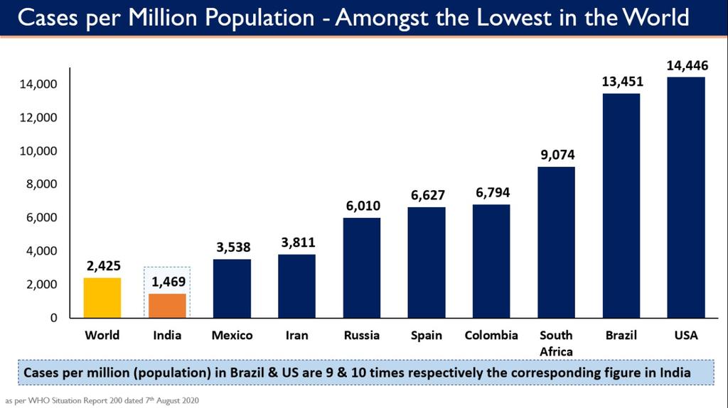 Compared globally, India has one of the lowest cases per million at 1469 as against the global average of 2425.