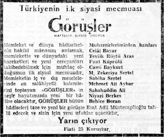 Bu oluşumun yayın organı olan Görüşler dergisinin ilk sayısını 1 Aralık 1945’te çıkarttı.