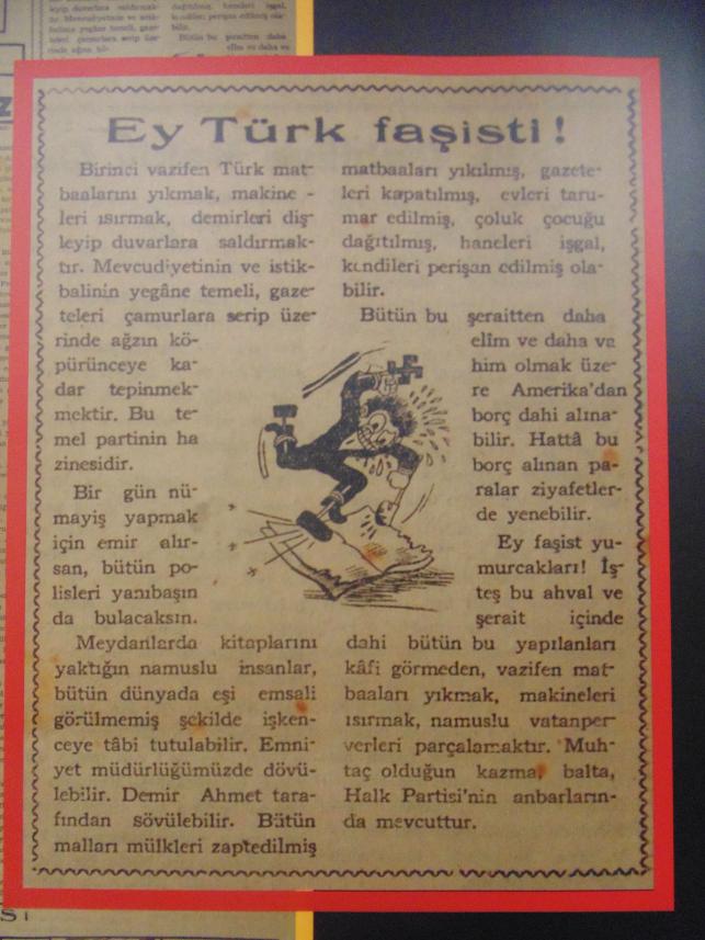 Ey faşist yumurcakları! İşte bu ahval ve şerait içinde dahi bütün bu yapılanları kafi görmeden, vazifen matbaaları yıkmak,